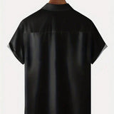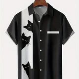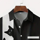 Manfinity camisa de talla grande para hombre con estampado de gato, manga corta, botones, bloque grafico de color blanco y negro, para salir y uso casual