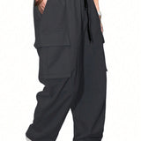 Manfinity hypemode pantalones de cargo negros holgados y grandes con bolsillo de solapa para hombre con cordon lateral en la cintura, ideales para salir
