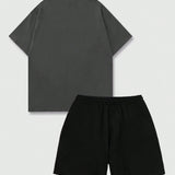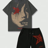Romwe street life 2 piezas camiseta de manga corta con estampado de retrato de hombre y pantalones cortos, adecuado para uso diario en primavera y verano, escuela