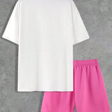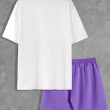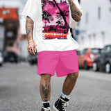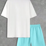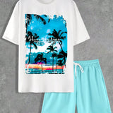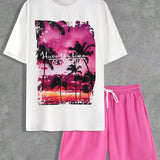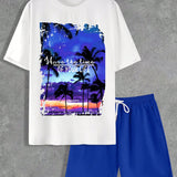 Manfinity homme conjunto informal de camiseta de manga corta con cuello redondo y pantalones cortos para hombre, estampado con lema y palmeras para verano