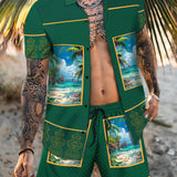 Manfinity rsrt conjunto de camisa de manga corta y shorts impresos con vista al mar para hombre de vacaciones