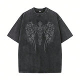 Camiseta casual de hombre de cuello redondo, mangas caidas y estampado de alas, lavado desgastado para el verano