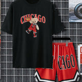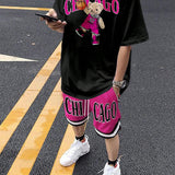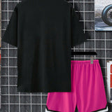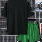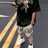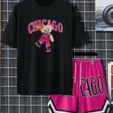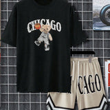 Manfinity sporsity conjunto de camiseta casual de verano para hombre con diseno de letra y oso, hombros caidos, cuello redondo y pantalones cortos con cintura con cordon y ajuste informal.