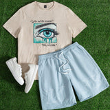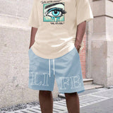 Manfinity emrg conjunto de camiseta casual de manga corta con cuello redondo y grafico de lema y ojo de verano para hombres + pantalones cortos con cordon en la cintura, para salir