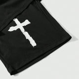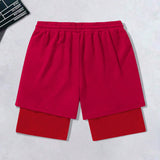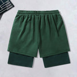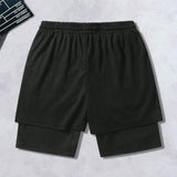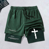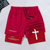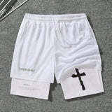 Manfinity legnd pantalones cortos casuales de doble capa para hombre con cintura de cordon y patron de eslogan impreso en cruz