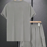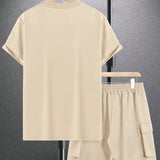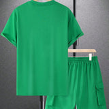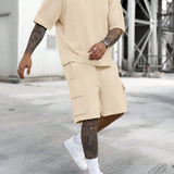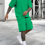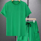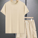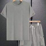 Manfinity emrg conjunto de camiseta casual de manga corta con cuello redondo y unicolor para hombres en verano, y pantalones cortos de carga con cordon en la cintura