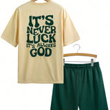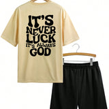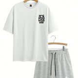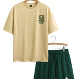 Manfinity homme conjunto de camiseta casual de manga corta de cuello redondo con estampado de lema de verano para hombre y pantalones cortos con cordon en la cintura, para salir