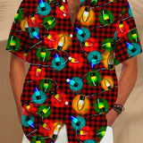 Camisa de manga corta con bolsillo con botones y estampado digital de luces coloridas retro navidenas para hombre talla grande, para fiesta navidena