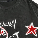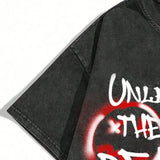 Manfinity emrg camiseta de manga corta con hombros caidos, lavado de nieve, estampado de llamas retro rojas y blancas, cara sonriente y pentagrama en grafiti de estilo callejero vintage para hombres, para rapero, para salir