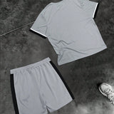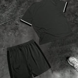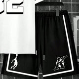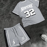 Manfinity homme conjunto casual de 2 piezas para hombre tallas grandes: camiseta cuello redondo con estampado de letras y numeros + pantalones cortos con cordon y bloqueo de color