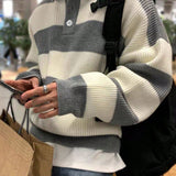 Homme sueter holgado de manga larga con bloqueo de color, rayas y cuello de botones tipo plaket para hombres talla grande, casual y urbano, para otono/invierno