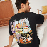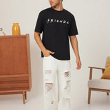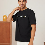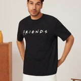 Friends x camiseta de manga corta casual para hombre, de color negro, con estampado de personaje de dibujos animados y letra, para verano