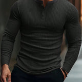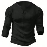 Camiseta de manga larga informal de cuello redondo con botones de unicolor para hombres, para primavera y otono