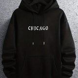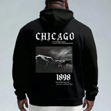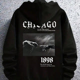 Sudadera con buzos con capucha de felpa con cordon casual de talla grande para hombres, con diseno del relampago de chicago en ingles