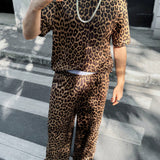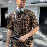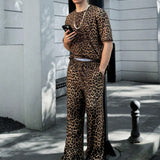 Manfinity rebelgame conjunto de 2 piezas de top de manga corta y pantalones de pierna recta con cintura elastica informal y estampado de leopardo para hombre