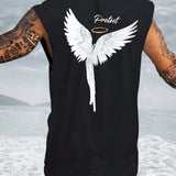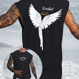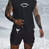 Conjunto casual de 2 piezas para hombre - atuendo deportivo de verano - camiseta sin mangas y pantalones cortos de carga con multiples bolsillos, con grafico de angel y letras "proteger", "californiano", " oeste", en color negro