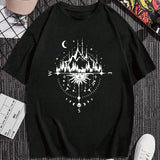 Camiseta casual de manga corta y cuello redondo de talla grande para hombre con estampado de bendicion de ramadan, letrero, luna, sol, arbol, brujula y estrella en degradado dorado, adecuada para fiestas familiares de ramadan