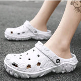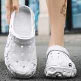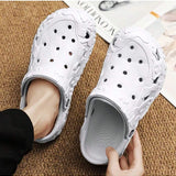 1 par de zuecos ligeros y comodos de malla para hombres, sandalias de jardin/playa con agujeros antideslizantes, pantuflas casuales para exteriores con suelas gruesas y antideslizantes (estampado asimetrico aleatorio en la parte superior)