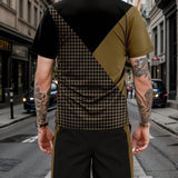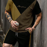 Conjunto de camiseta de manga corta y pantalones cortos con estampado de pata de gallo y parches de color contrastante para hombre