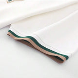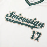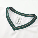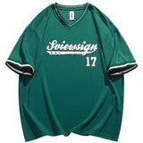 Camiseta de manga corta informal con cuello en v, hombros caidos, patron de rayas multicolor y bloques de letras y numeros
