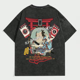 Camiseta de manga corta con grafico de arquitectura antigua de tokio, samurais, texto japones y hombros caidos en color negro con efecto desgastado y lavado, adecuada para uso diario, escuela, regalo, estilo callejero