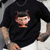 Camiseta de manga larga y cuello redondo para hombres de talla grande, estampado grafico casual de nezha de moda urbana, estilo de verano