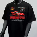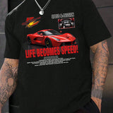 Camiseta de cuello redondo de manga corta con patron de carreras y pantalones casuales para hombres, adecuado para viajes, vacaciones, campamentos al aire libre y deportes