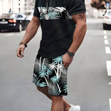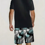 Conjunto de 2 piezas, camiseta de manga corta con estampado de arboles de coco hawaianos y pantalon corto con cordon y bolsillos con estampado todo sobre para hombre, estilo casual de vacaciones