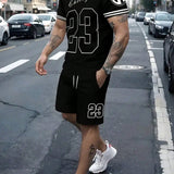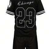 Traje casual para hombre de poliester, camiseta de cuello redondo con estampado de chicago y pantalones cortos, tejido de punto con estiramiento ligero, estilo regular - 100% poliester