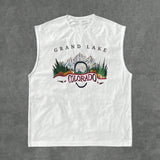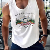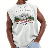 Chaleco casual de hombre con estampado de bosque y letra impresa, combinado con pantalones casuales, apropiado para viajes/vacaciones/acampada al aire libre/deportes