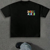 Camiseta unisex de talla grande con letras de patchwork impresas digitalmente sin afectar la textura de la tela. comoda, suave y transpirable. adecuada para el uso diario en verano. cuello redondo, de moda, versatil, estilo y2k, unisex, camiseta