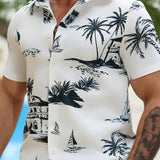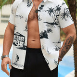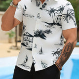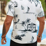 Manfinity rsrt camisa holgada de manga corta informal con estampado de plantas tropicales, arboles de palma y casas, adecuada para vacaciones