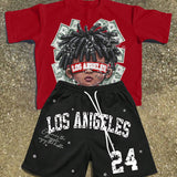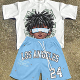 Manfinity streetrush conjunto de camiseta casual de manga corta y cuello redondo con estampado de personajes de dibujos animados y shorts con cordon en la cintura para hombre