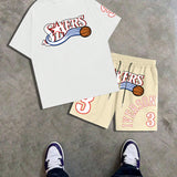 Conjunto de camiseta de manga corta de cuello redondo blanca y pantalones cortos deportivos beige para hombres, con impresion de numero y letra de baloncesto, apto para uso diario casual, viajes y deportes