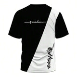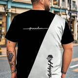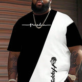 Camiseta de hombre talla grande en color negro y blanco con diseno de contraste, impresion de letras y graficos en la espalda, informal y llamativa, transpirable y holgada