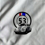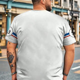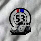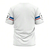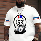 Camiseta casual con manga corta y estampado digital blanco talla grande para hombres, con numeros "53" y graficos de autos, transpirable