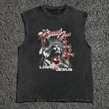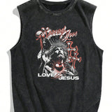 Camiseta de algodon lavada de cuello redondo informal con estampado de carta de amor con cruz, estilo callejero de moda y2k adecuada para uso diario, talla grande para hombres