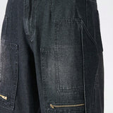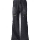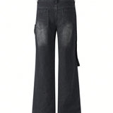 Jeans casuales de pierna ancha de moda para hombres, de unicolor con bolsillos y parches